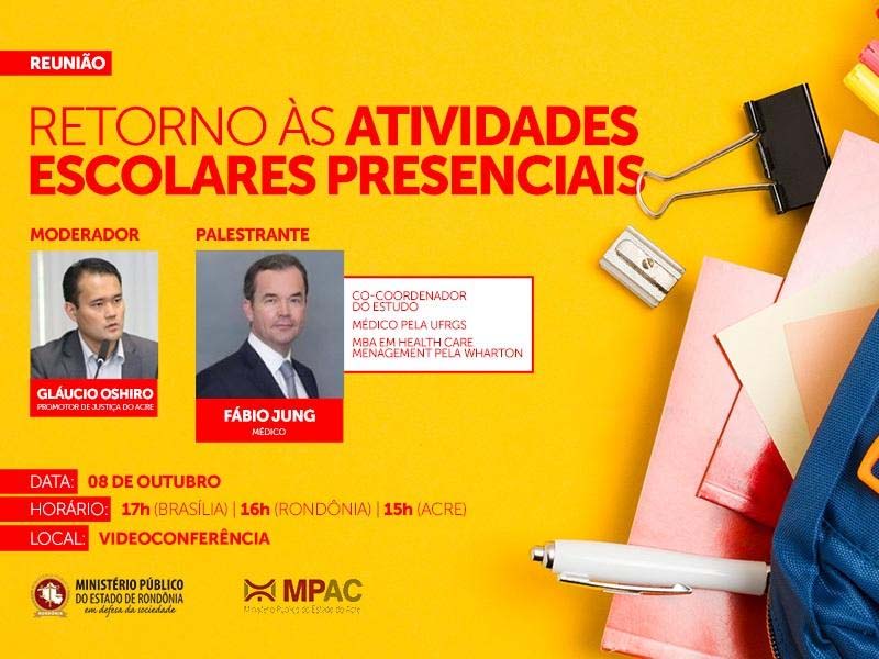 O Ministério Público de Rondônia, em parceria com o Ministério Público do Acre, realizará na próxima quinta-feira (08/10), às 16h (horário local), reunião virtual com secretários de Saúde e Educação de ambos os estados para debate das recomendações e orientações sanitárias, visando ao possível retorno das atividades escolares presenciais. O evento terá como palestrante o médico Fábio Jung, integrante da equipe de elaboração do Plano de Reabertura de Atividades do Rio Grande do Sul.