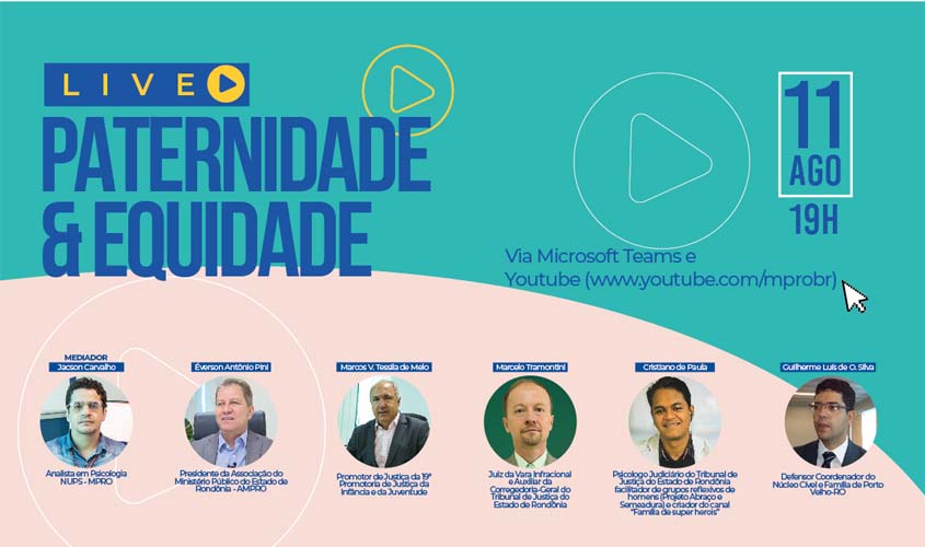 O Ministério Público de Rondônia, por meio do Grupo de Atuação Especial da Infância e Juventude e Defesa da Educação, realizará na quinta-feira (11/8), às 19h, a live “Paternidade e Equidade”, cujo debate, aberto à sociedade civil de forma gratuita, tem como objetivo proporcionar reflexão sobre paternidade responsável.