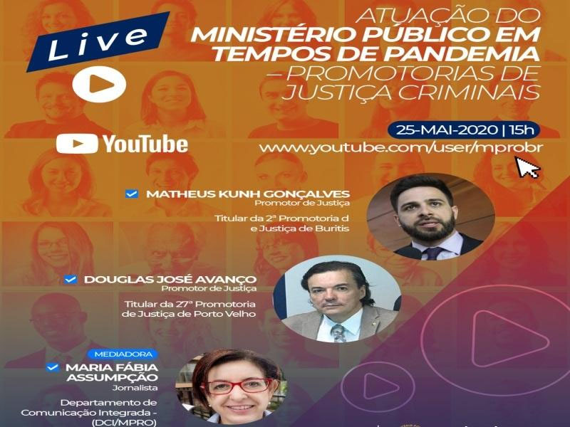 O Ministério Público do Estado de Rondônia vai realizar mais uma live na segunda-feira (25/5), a partir das 15 horas, com transmissão pelo canal do Youtube (youtube.com/user/mprobr), abordando a atuação das Promotorias de Justiça Criminais em Tempo de Pandemia do Coronavírus. Na pauta da conversa, temas como audiências virtuais, funcionamento dos plantões judiciais, os julgamentos no Tribunal do Júri, entre outros.