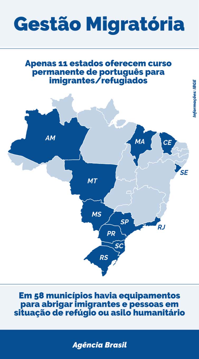 No cenário estadual, apenas 11 unidades da federação oferecem curso permanente de português para imigrantes ou refugiados: Amazonas, Maranhão, Ceará, Sergipe, Rio de Janeiro, São Paulo, Paraná, Santa Catarina, Rio Grande do Sul, Mato Grosso e Mato Grosso do Sul.