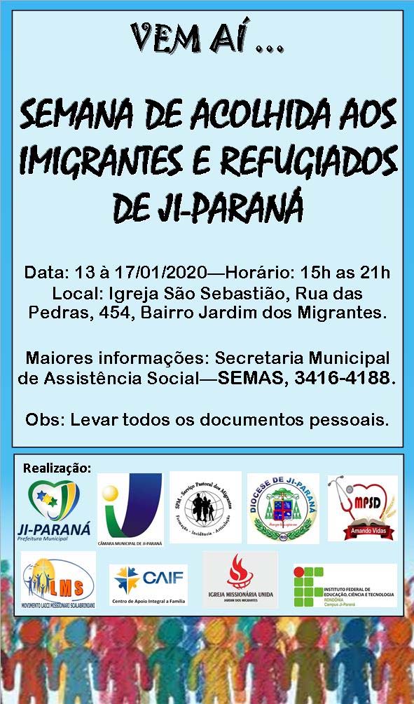 A Semana de Acolhimento para estrangeiros será realizada entre os dias 13 e 21 de Janeiro, no horário das 15:00 horas às 21:00 horas, na igreja São Sebastião, no bairro Jardim dos Migrantes. A semana é uma ação do Comitê, criado em Ji-Paraná, visando o acolhimento de estrangeiros que estão na cidade em situação de vulnerabilidade social.