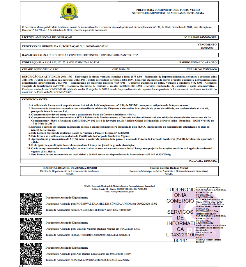 N & T INDÚSTRIA E COMÉRCIO DE TINTAS E IMPERMEABILIZANTES LTDA, CNPJ: 48.566.279/0001-00, TORNA PÚBLICO QUE RECEBEU DA SECRETARIA MUNICIPAL DE MEIO AMBIENTE – SEMA, DA PREFEITURA DE PORTO VELHO – RO, A LICENÇA AMBIENTAL DE OPERAÇÃO Nº 016.00009.005/2026-SUL, PROCESSO Nº SUL.0000024699/2025-E, COM VALIDADE ATÉ 18/01/2030, REFERENTE ÀS ATIVIDADES DE FABRICAÇÃO DE TINTAS, IMPERMEABILIZANTES, COLETA DE RESÍDUOS PERIGOSOS E NÃO PERIGOSOS, COMÉRCIO ATACADISTA DE PRODUTOS QUÍMICOS E RECUPERAÇÃO DE MATERIAIS, LOCALIZADA NA RUA RIO LAJE, Nº 12718, BAIRRO RONALDO ARAGÃO, MUNICÍPIO DE PORTO VELHO – RO.