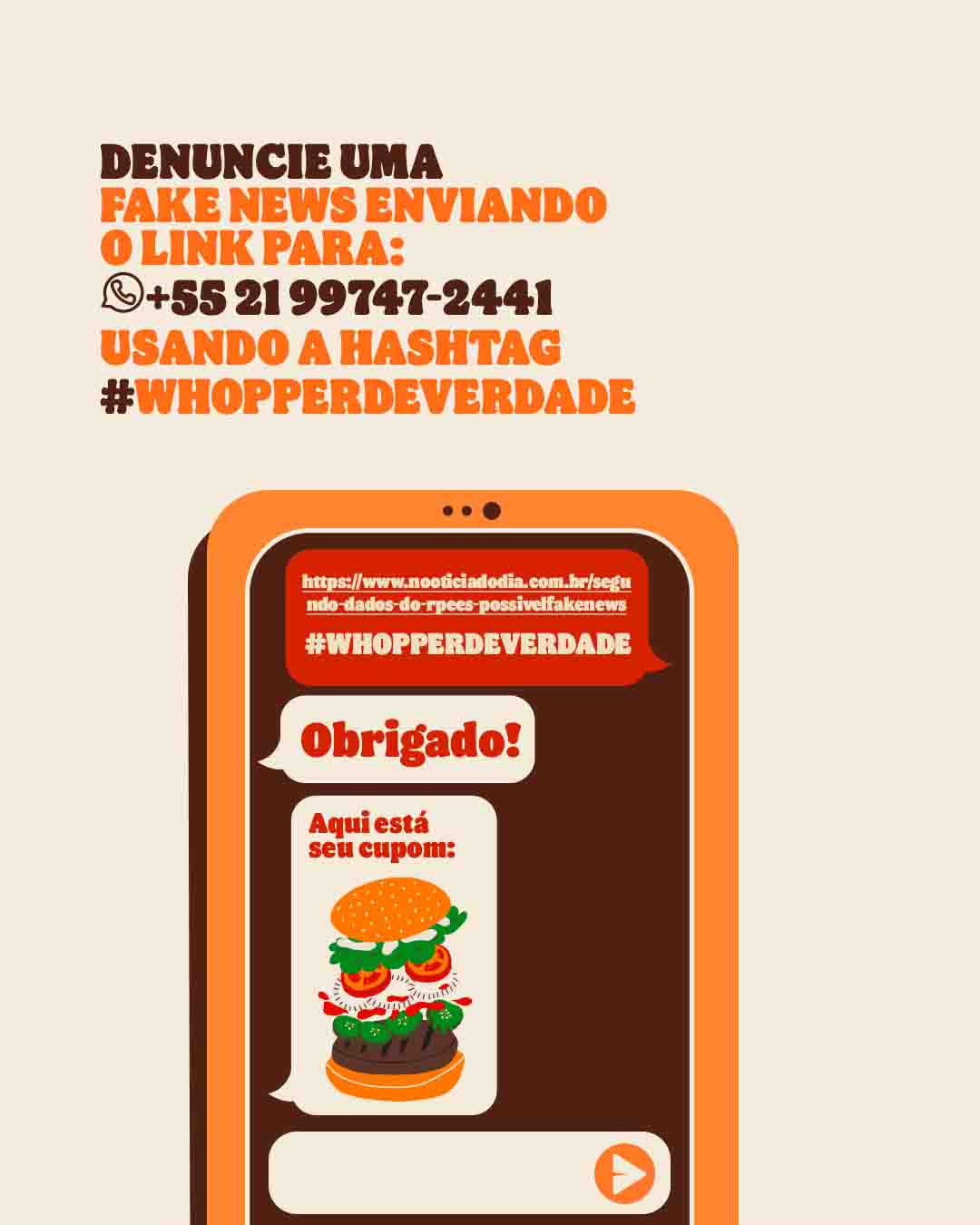 Os consumidores deverão enviar suas suspeitas de fake news diretamente para o bot Fátima, do Aos Fatos, no número (21) 99747-2441. Para participar da ação, o cliente precisa enviar a hashtag #WHOPPERDEVERDADE, e na sequência reportar o link da notícia falsa. Após o envio, ele receberá automaticamente uma mensagem de resposta, contendo um cupom de desconto de R$ 14,90, valor equivalente a um WHOPPER®, junto com o passo a passo para o resgate, que poderá ser realizado em uma compra a partir de R$ 29,90 para que o desconto seja aplicado no BK Delivery até 15 de abril de 2022. A fake news será avaliada posteriormente pela equipe do Aos Fatos.
