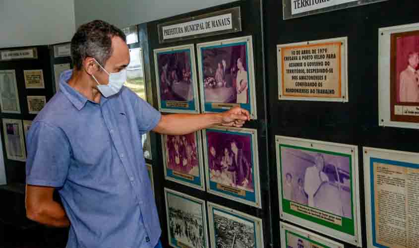 Caminhando pelos painéis de fotos do Mausoléu, Silva aponta algumas, nas quais o então prefeito de Manaus inaugura a ponte do bairro Educandos, com a presença do então governador Enoch Reis.