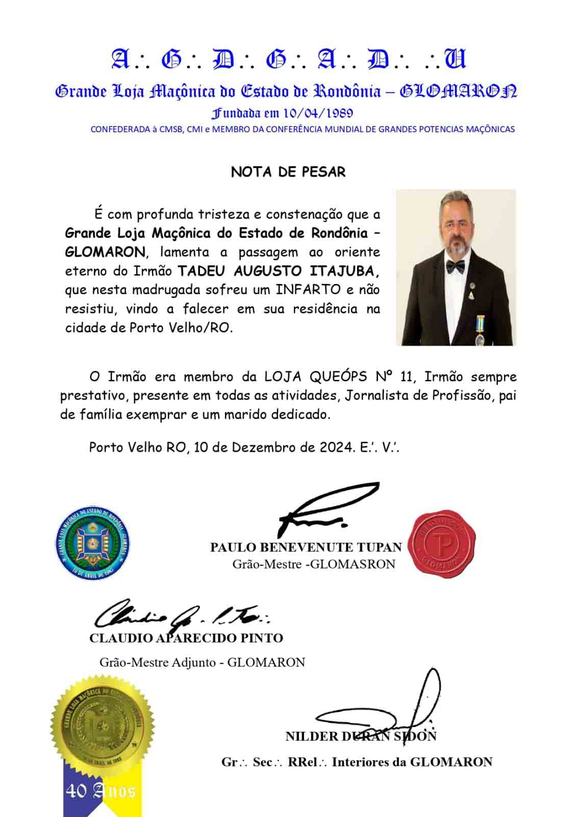 O irmão era membro da Loja Queóps nº11, irmão sempre prestativo, presente em todas as atividades, jornalista de profissão, pai de família exemplar e um marido dedicado