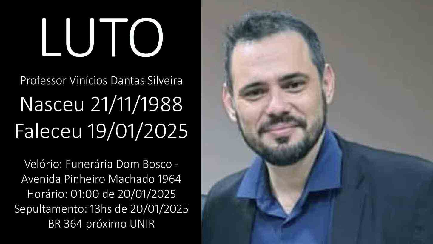 Porto Velho, RO - O vereador Everaldo Fogaça (PSD) manifesta seu profundo pesar pelo falecimento do professor Vinicius Dantas Silveira, ocorrido neste domingo, 19, em Porto Velho, Rondônia. Vinicius, de 36 anos, era um dedicado profissional da educação, lecionando na faculdade FIMCA, e atuava como servidor público na Prefeitura de Candeias do Jamari e na SESDEC.