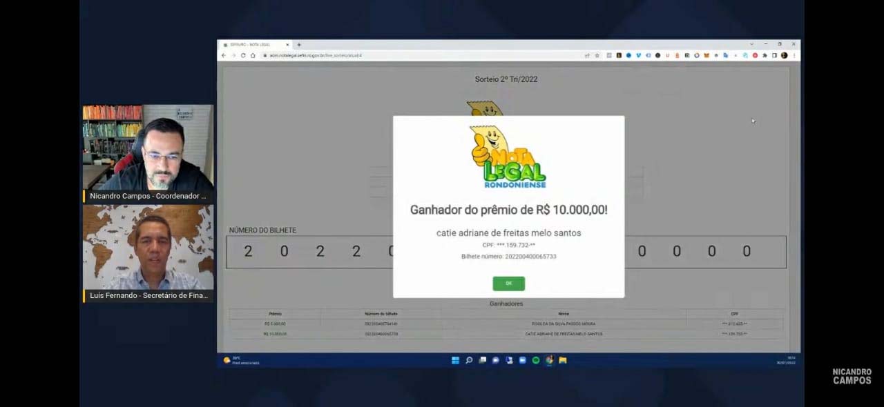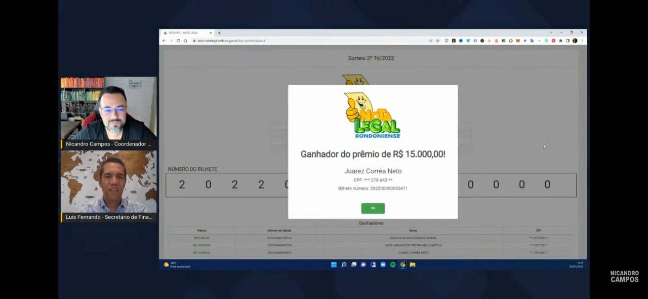 O 2º Sorteio Trimestral do Programa Nota Legal Rondoniense foi realizado neste sábado, 30, às 16h, transmitido ao vivo através de live. Foram distribuídos R$ 30.000, divididos em 3 prêmios: R$ 5.000, R$ 10.000 e R$ 15.000. Os sorteios acontecem a cada 3 meses e contemplam contribuintes que se cadastraram no programa e solicitaram o CPF em seus cupons fiscais.