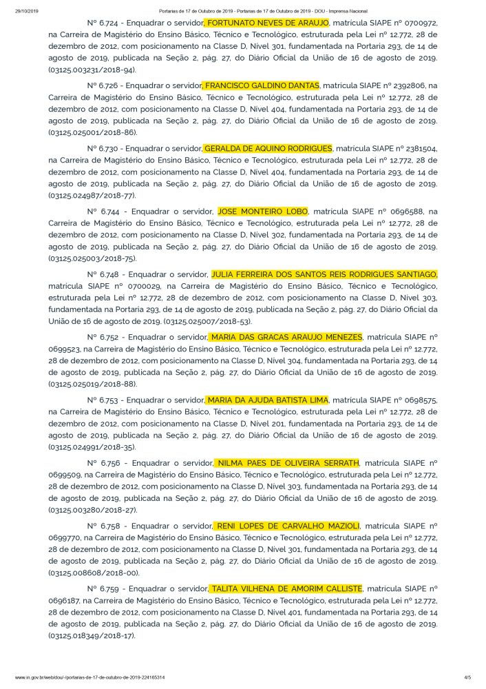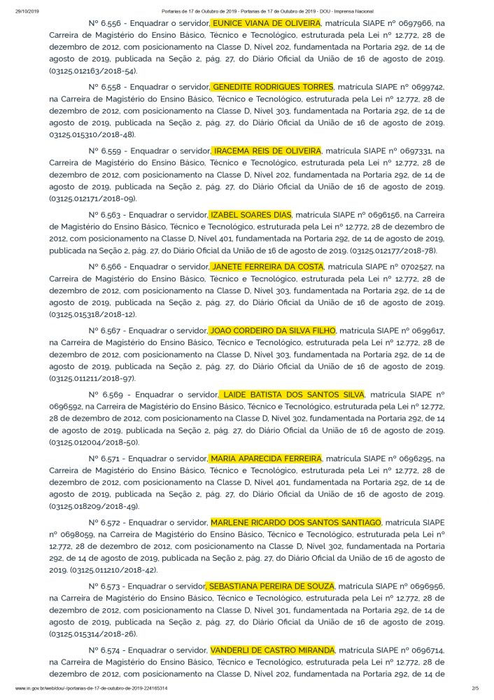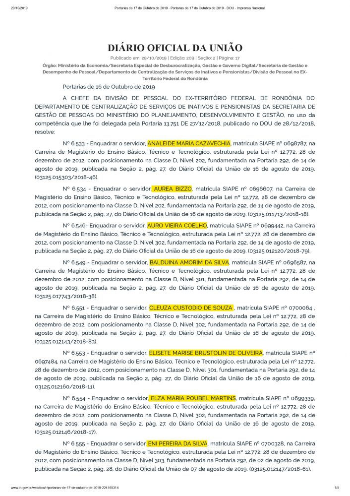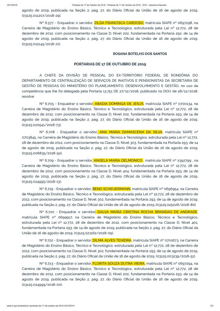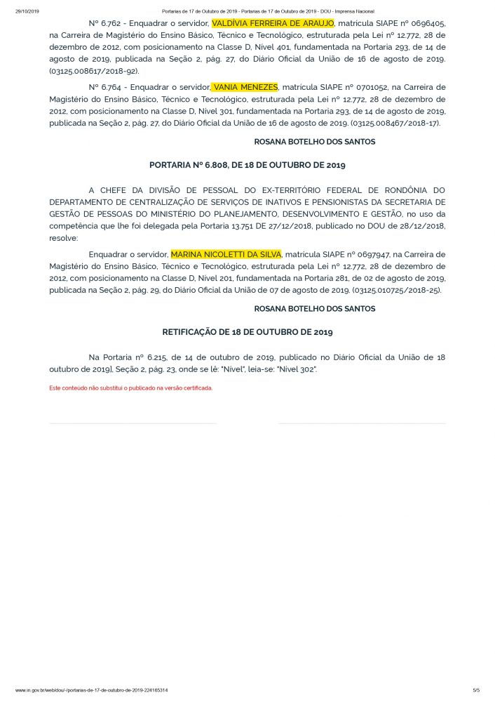 O Diário Oficial da União divulgou nova Portaria, nesta terça-feira (29/10), enquadrando novos professores de Rondônia na Carreira de Magistério do Ensino Básico Técnico e Tecnológico (EBTT).