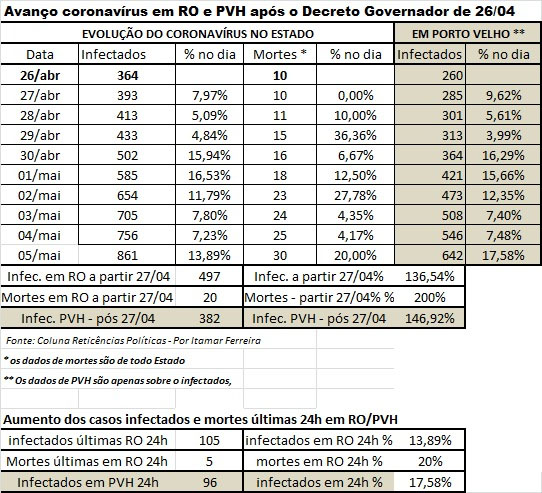 Veja a evolução da pandemia em Rondônia e em Porto Velho, após o Decreto do governado e do secretário de saúde, publicado em 26/04/2020, até este 05/05/2020.