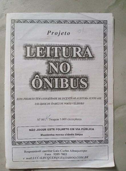 “Este folheto tem a finalidade de incentivar a leitura dos usuários de ônibus de Porto Velho”, o “Leitura no Ônibus”, uma ideia do escritor Luiz Carlos Albuquerque, distribuído gratuitamente, era direcionado à cultura e à história da capital estadual.