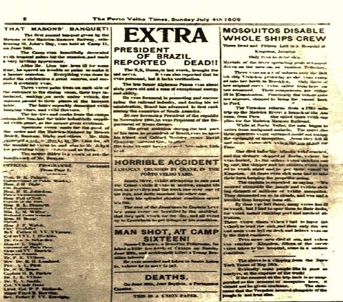 FOTO DO DIA: 4 de julho de 1909 – Porto Velho, ainda engatinhando como cidade, ganha seu primeiro veículo de comunicação, o jornal “The Porto Velho Times”, todo em língua inglesa, editado e impresso na oficina da construtora da Madeira-Mamoré. Na Página 2 da 1ª edição, noticiada a morte “do presidente Alphonso Penna”, no exercício do cargo, também que mosquitos atacaram a tripulação de um navio; um “Horrível Acidente” com um homem, supostamente morto por uma sucuri no porto da vila, e o primeiro evento social que se tem notícia na cidade que começava, “Aquele Jantar Maçônico”, realizado dia de São João Batista, um dos padroeiros da maçonaria – o outro é São João Evangelista, num acampamento da Madeira-Mamoré, enumerando quem participou, quem ficou responsável pela cozinha, oradores etc. Entre os participantes, nenhuma mulher. (F. Acervo Anísio Goraieb cedida a Lúcio Albuquerque).