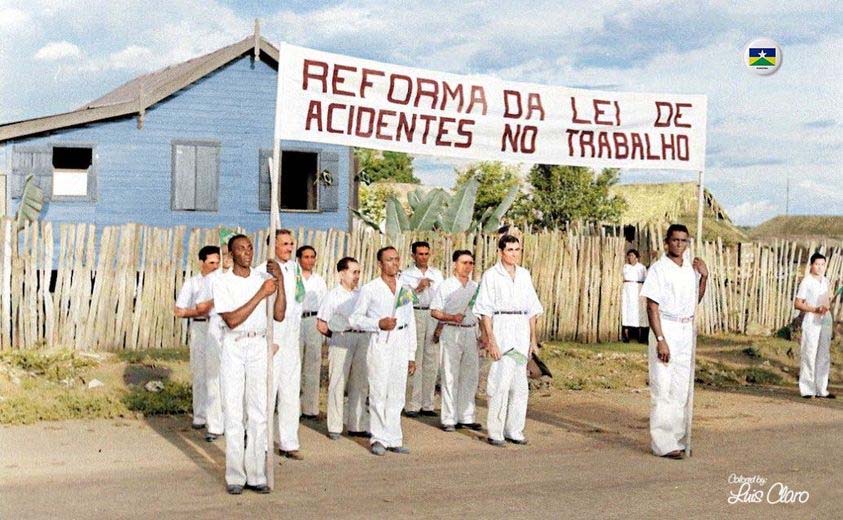 FOTO DO DIA: 1940 – O presidente Getúlio Vargas desembarca em Porto Velho onde ficará, de 11 a 13 de outubro, o mais longo período que um presidente da República ficou em terras rondonienses, e um grupo de trabalhadores, provavelmente da Ferrovia Madeira-Mamoré, o saúda com faixa citando a Reforma da Lei de Acidentes do Trabalho, que Getúlio fizera através do Decreto-Lei 24.637, de 1934, “legislação considerada a primeira qual traz expressamente em seu corpo a obrigatoriedade de serem conferidos aos trabalhadores os equipamentos de proteção individual (EPI) e dos dispositivos necessários a proteção coletiva (EPC) tão necessários à preservação da integridade física dos trabalhadores no desempenho de suas atividades laborais”. (*). F. Acervo RondoniaminhaqueridaRondônia, colorizada por Luís Claro.