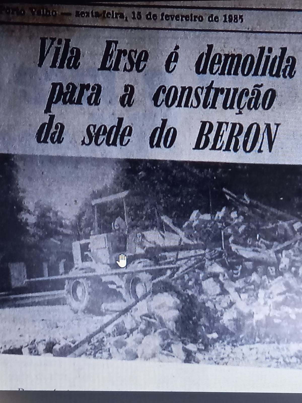 Foto: Jornal Alto Madeira, 15.2.1985 – a máquina derrubando a “Vila Erse” para dar lugar à sede do Beron, atual “Casa de Cultura “Ivan Marrocos”.