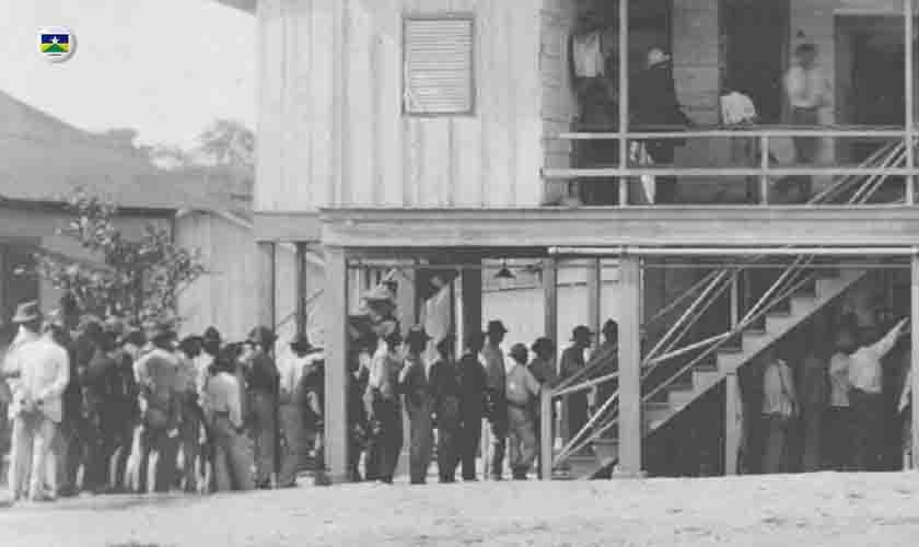 FOTO DO DIA : Dia de pagamento dos trabalhadores da ferrovia Madeira/Mamoré, com a fila subindo ao andar de cima da administração da EFMM na sede em Porto Velho. A obra, parte do Tratado de Petrópolis pelo qual o Brasil assumiu as terras antes bolivianas, mas invadidas por seringueiros brasileiros no que depois seria o Estado do Acre. Trabalhadores trazidos de entre 40 e 50 países, a ferrovia que deu origem ao Estado de Rondônia, e que funcionou durante 60 anos até ser extinta. O contrato para a construção estabelecia que o ponto inicial seria na cidade de Santo Antônio, mas depois estendido à jusante cerca de 7 KM, o canteiro de obras que originou a cidade de Porto Velho. (F. Dana Merril, Acervo Rondônia Minha Querida Rondônia, foto colorizada por Luís Claro)