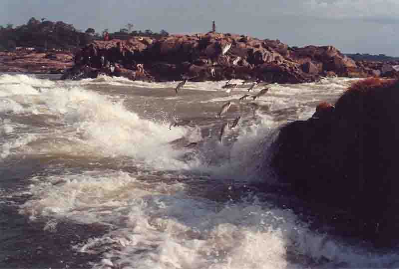 FOTO DO DIA: - Vila de Teotônio - peixes subindo a cachoeira Um espetáculo que não existe mais: na cachoeira de Teotônio (Rio Madeira a montante de Porto velho), época de piracema (movimento migratório de peixes com fins de reprodução), cardumes imensos se atiravam tentando passar além do pedral e seguir viagem rumo aos locais de reprodução durante a cheia do rio e dos seus igarapés. Dos muitos que saltavam tentando vencer as corredeiras e o pedral, uma boa quantidade de peixes acabavam caindo em buracos escavados pelas águas nas rochas, onde eram capturados pelos pescadores, à mão livre. O local foi destruído e em seu lugar construída uma das duas usinas hidrelétricas do Rio Madeira, parra aumentar a geração de energia elétrica do país (Acervo Rondônia Minha Querida Rondônia, foto Dana Merril, colorizada por Luís Claro