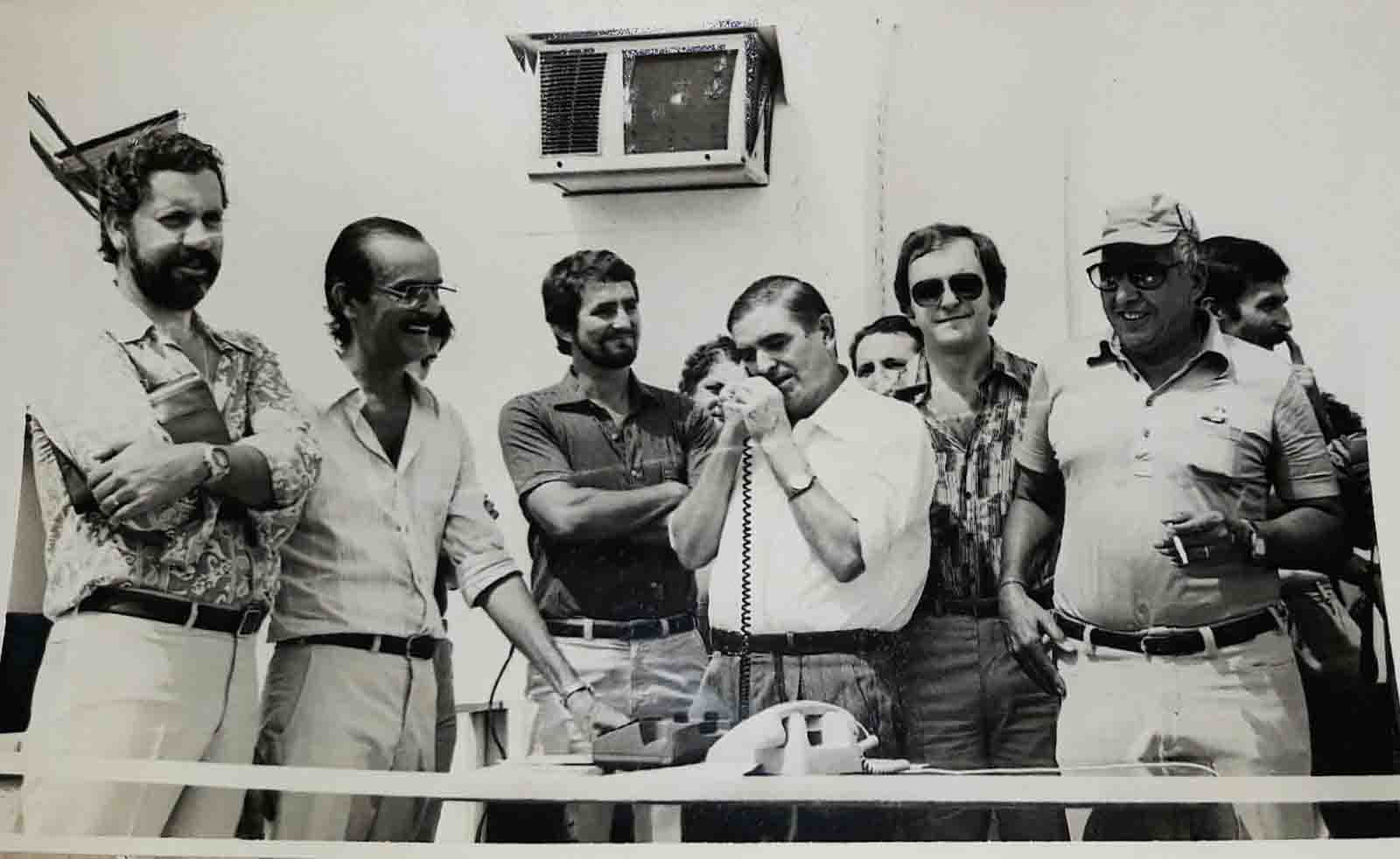 FOTO DO DIA: 1981 - Num ambiente de muita solenidade e grande importância para Rondônia, o município de Ji-Paraná ganhava a partir de então a telefonia pelo sistema DDI – Discagem Direta Internacional. O governador Jorge Teixeira (de boné, à direita), admitiu que um cidadão português ali residente fizesse a ligação de inauguração, para sua casa numa aldeia em Portugal só que, pelo visto, o cidadão fazia tempo que não falava com a parentada, e aí, debaixo de um sol de rachar, ele começou a falar, e haja parentes, enquanto (da esquerda para a direita) o prefeito Assis Canuto, o jornalista Ciro Pinheiro, o engenheiro Noé e o presidente da Teleron Sílvio Santiago, além de Teixeira, pouco mais tinham a fazer do que ficar sorrindo e, talvez secretamente, fazendo uma oração para que o “portuga” decidisse deixar continuar a cerimônia.