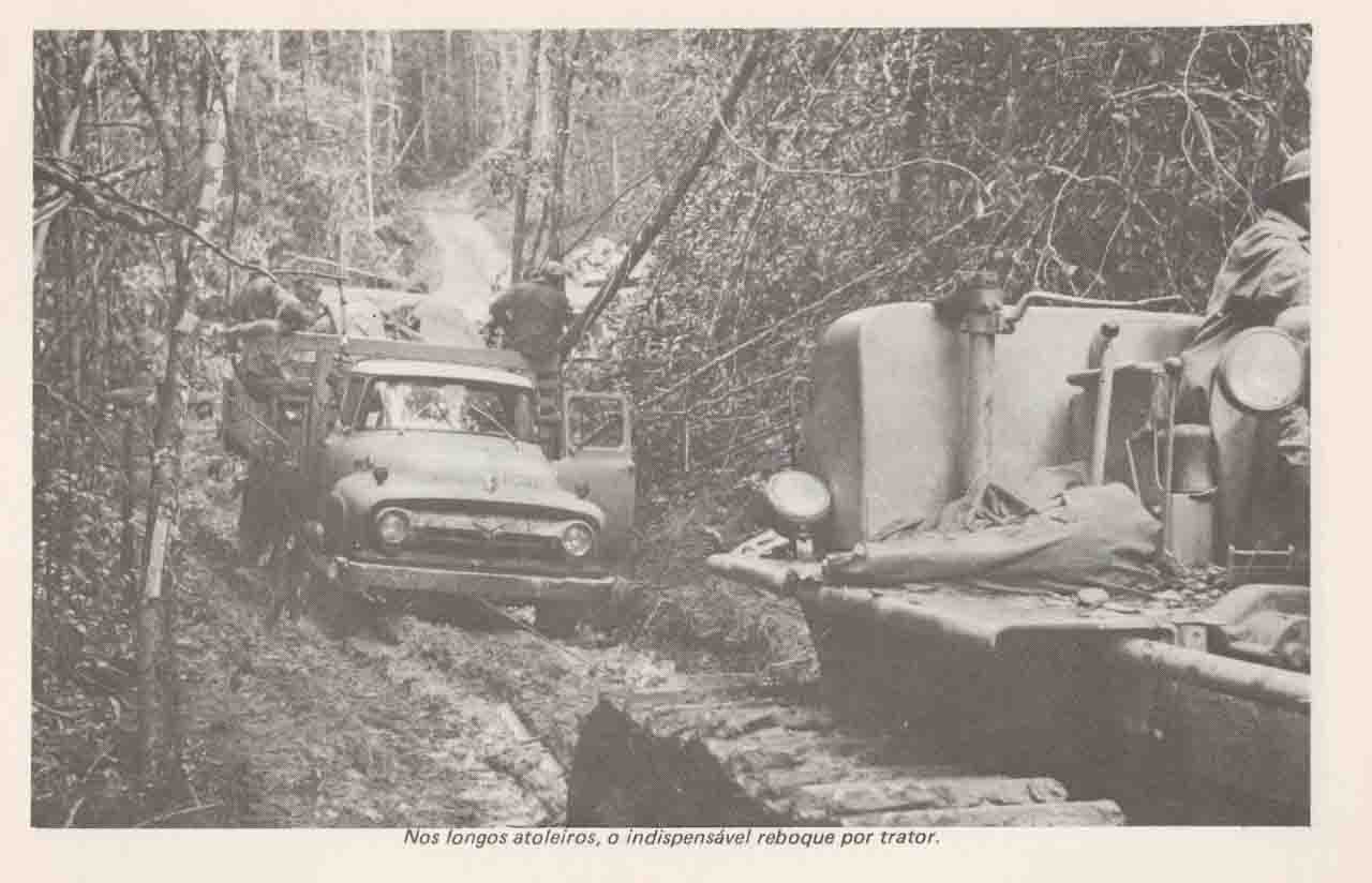 FOTO DO DIA: Há 61 anos, na noite de 28 de dezembro, praticamente toda a população de Porto Velho, em torno de 52 mil moradores, fez festa, para receber a “Caravana Ford”, um grupo de caminhões e outros veículos saídos de São Paulo há exatos dois meses, a primeira comitiva de carros a vencer a rodovia BR-029 (364), então apenas um traço aberto na selva amazônica. Uma viagem só possível pela disposição do governador Paulo Leal que designou um grupo de funcionários do Território para trazer os veículos – vieram também dois carros particulares e uma viatura adquirida pelo governo do Acre. Uma viagem muito difícil com os caravaneiros contando em alguns trechos com o apoio das empresas que ainda trabalhavam na abertura da estrada, cujos tratores arrastavam (foto) os caminhões nos atoleiros, especialmente no trecho Pimenta Bueno a Jaru. Um dos caravaneiros, o mecânico Gervásio, mantém em sua casa no Bairro Arigolândia um painel com dezenas de fotos da viagem.