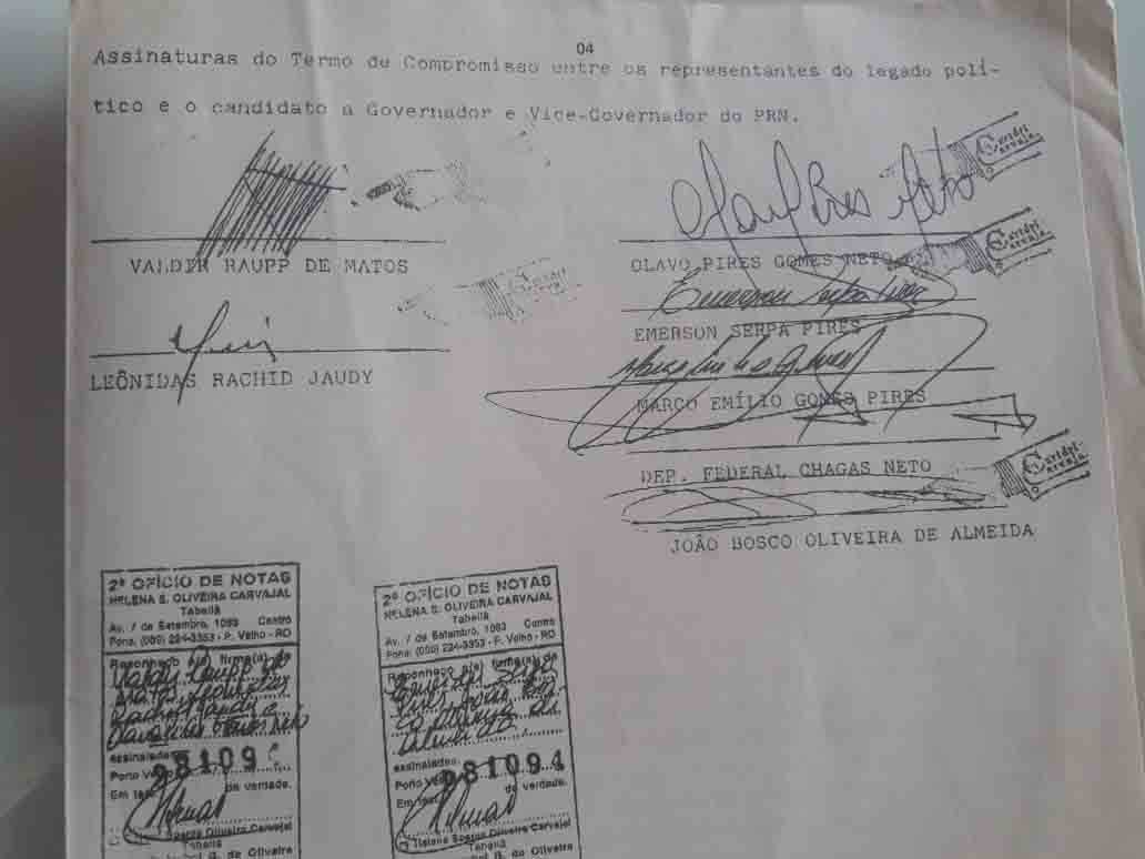 FOTO DO DIA: Eleição de 1990 em Rondônia – O senador Olavo Pires e Valdir Raupp ficam em 1º e 2º lugar no turno, mas dias depois Olavo Pires é assassinado e o 3º colocado, Osvaldo Piana, convocado para a disputa. Lodo depois é divulgado pela imprensa denunciando uma espécie de contrato de loteamento de cargos em caso da eleição de Raupp. O documento, conforme publicações dos jornais à época, era assinado por Raupp, seu vice Leônidas Rachid, Olavo Pires Gomes Neto, Emerson Serpa Pires, Marco Emílio Gomes Pires (sobrinho, filho e irmão de Olavo), além dos membros da coordenação da campanha, o deputado federal Chagas Neto e o empresário João Bosco Almeida, com respectivas firmas reconhecidas em cartório. O grupo todo alegou serem falsas as citações. Ao final Piana venceu o returno e tornou-se, até agora, o único rondoniense nato a governar o Estado.
