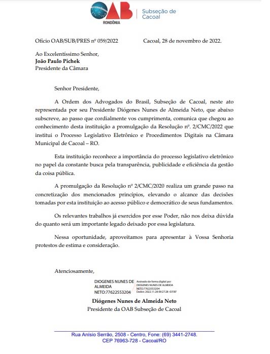 O Presidente da Ordem dos Advogados do Brasil (OAB), Subseção de Cacoal, Dr. Diógenes Nunes de Almeida Neto, parabenizou a iniciativa do Presidente do Poder Legislativo, João Paulo Pichek (Republicanos), e a Mesa Diretora pela implantação do processo legislativo eletrônico e procedimentos digitais: