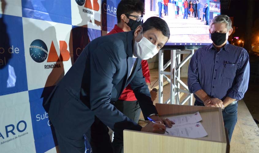 Em uma cerimônia na noite desta terça-feira (06), o diretor tesoureiro da OAB Nacional, José Augusto Araújo de Noronha; o presidente da OAB Rondônia, Elton Assis; o presidente da Subseção de Cacoal, Diógenes Nunes de Almeida Neto; e o sócio proprietário da construtora Aripuana, Antônio Bisconsin; assinaram a ordem de serviço para a retomada da construção da sede da Subseção de Cacoal.