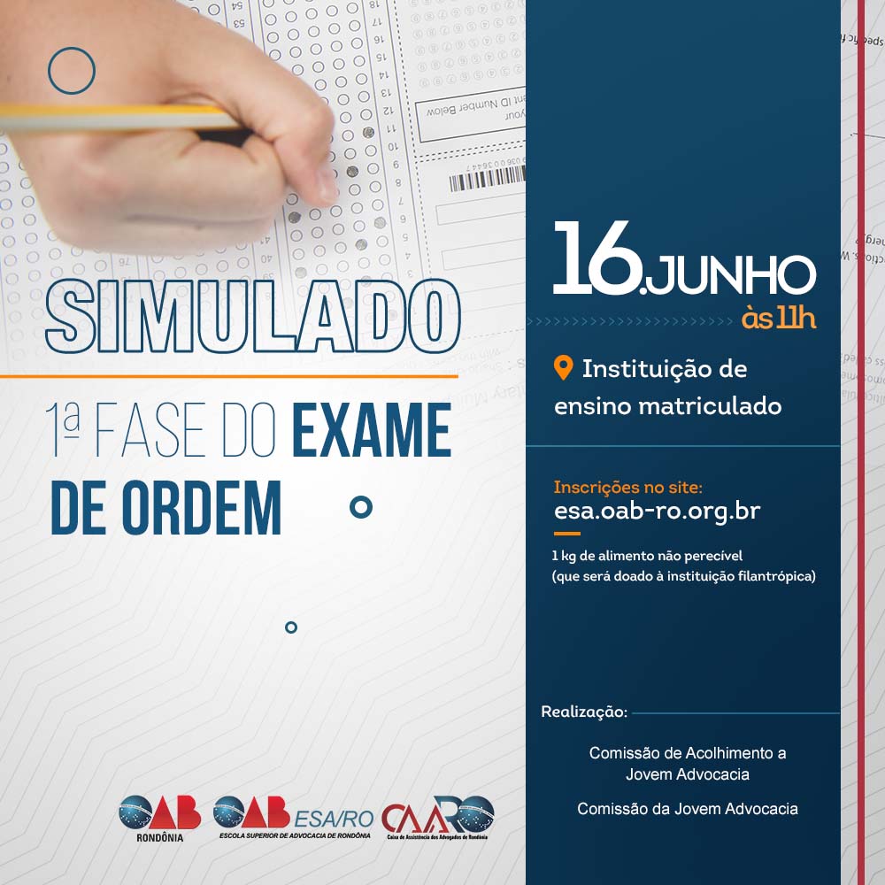 A Ordem dos Advogados do Brasil – Seccional Rondônia (OAB/RO), por meio da Comissão de Acolhimento ao Jovem Advogado (Caja), realizará o Simulado do Exame de Ordem, no dia 16 de junho, às 11h, na instituição de ensino que o aluno é matriculado. A iniciativa conta com apoio da Escola Superior da Advocacia de Rondônia (ESA/RO) e Caixa de Assistência dos Advogados de Rondônia (Caaro).
