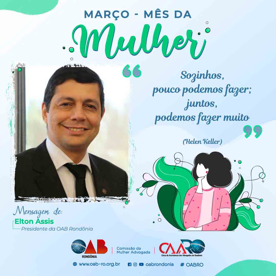 Para comemorar a data, o presidente da OAB Rondônia, Elton Assis, escolheu a frase: “Sozinhos, pouco podemos fazer; juntos, podemos fazer muito”, de autoria da escritora, conferencista e ativista social norte-americana, Helen Keller.