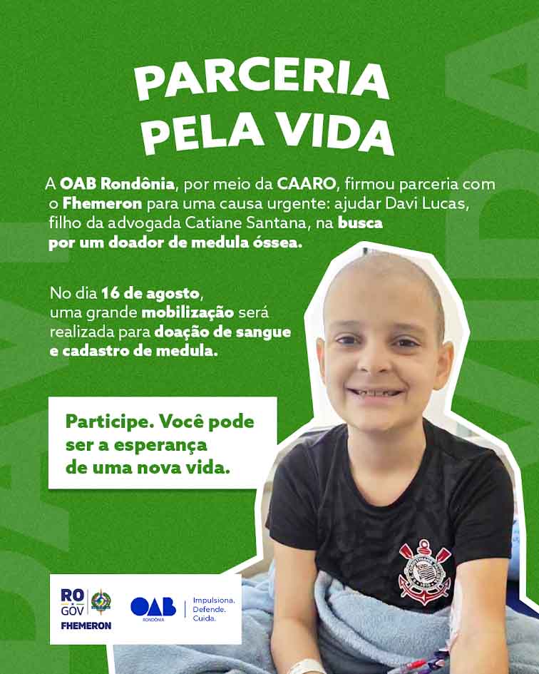 A Ordem dos Advogados do Brasil – Seccional Rondônia (OAB RO), por meio da Caixa de Assistência dos Advogados de Rondônia (CAARO), firmou uma importante parceria com a Fundação de Hematologia e Hemoterapia de Rondônia (Fhemeron) para realizar uma grande mobilização solidária no próximo dia 16 de agosto, em prol de encontrar um doador de medula óssea compatível com o pequeno Davi Lucas, filho da advogada Catiane Santana.