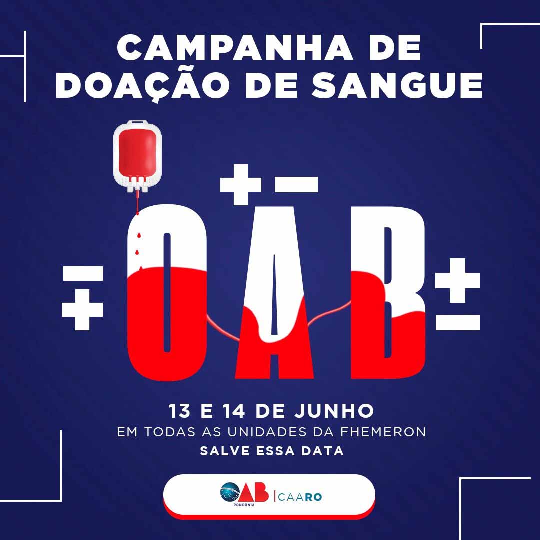 Em gesto de amor e de solidariedade ao próximo, a OAB Rondônia convida toda a advocacia para, nesta segunda (13) e terça-feira (14), participar na 1ª edição da campanha de doação de sangue promovida pela instituição em todas as unidades do Fundação de Hematologia e Hemoterapia do Estado de Rondônia (Fhemeron). A ação é também para celebrar o Dia Mundial do Doador de Sangue, em 14 de junho.