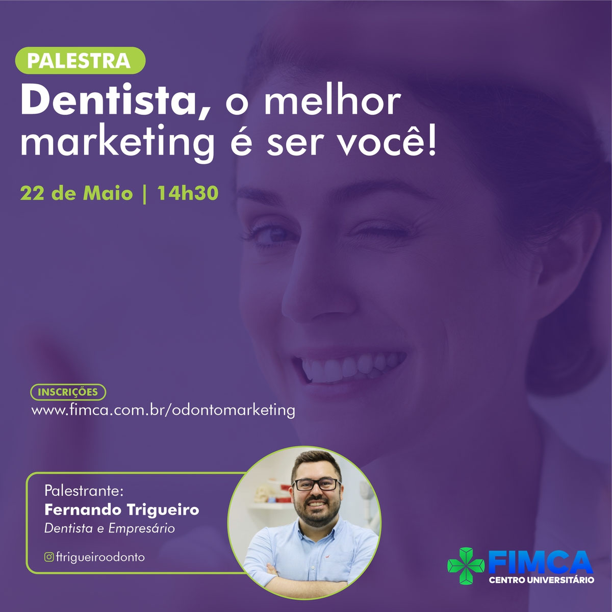O Palestrante convidado para a ocasião será Fernando Trigueiro, Dentista e Empresário. A palestra será transmitida pelo Meet, de forma gratuita e com capacidade máxima para 250 participantes e está programada para começar as 14h e 30, as inscrições poderão ser feitas pelo site www.fimca.com.br/odontomarketing .