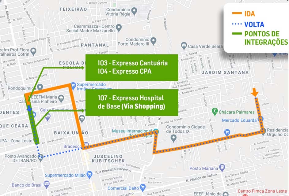 A linha que atende os usuários da Zona Leste, faz integração com as linhas 103 – Expresso Cantuária, 104 – Expresso CPA e 107 – Expresso Hospital de Base (Via Shopping). Os usuários poderão fazer a integração na Av. Mamoré no trecho entre as avenidas Amazonas e Rio de Janeiro.