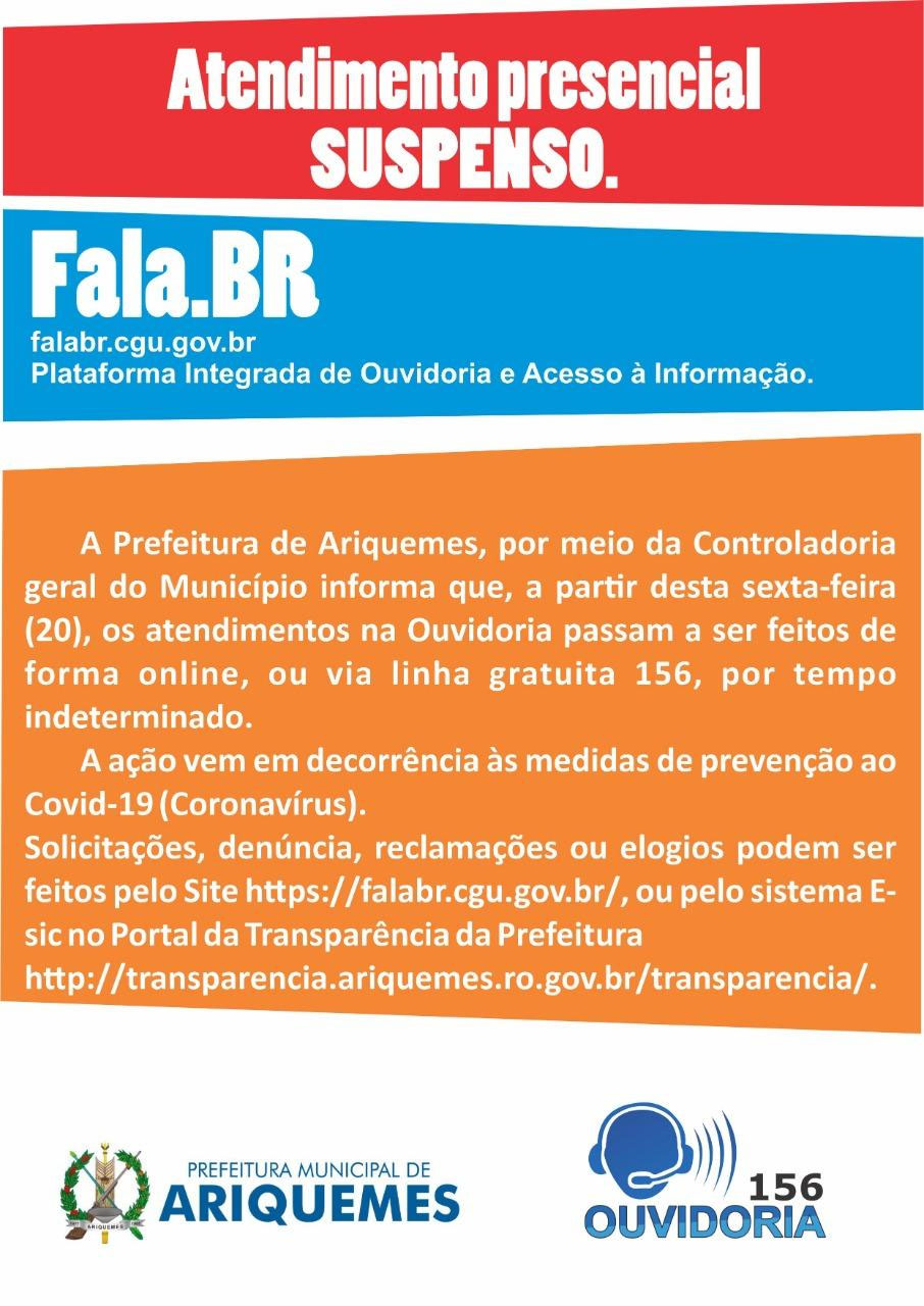 A Prefeitura de Ariquemes, por meio da Controladoria geral do Município informa que, a partir desta sexta-feira (20), os atendimentos na Ouvidoria passam a ser feitos de forma online, ou via linha gratuita 156, por tempo indeterminado.