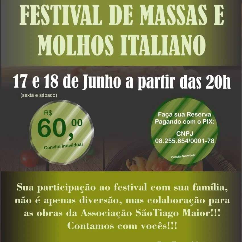 Uma grande pedida para quem gosta de massa italiana, e da melhor qualidade, será o festival nesta sexta-feira e amanhã, sábado, na Comunidade São Tiago Maior.