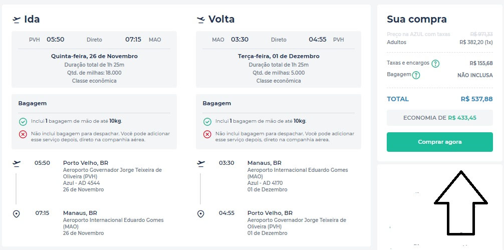 Mais uma oportunidade para você viajar para os destinos nacionais preferidos pelos brasileiros. Neste final de semana as companhias aéreas que operam em Rondônia e no Acre incluíram os dois estado na promoção "esquenta" Black Friday 2020. De Porto Velho para Manaus, em voo direto, as passagens de ida e volta para viagem ainda em novembro podem ser compradas por apenas RF$ 537,98, valor com as taxas incluídas. (Veja detalhes na imagem abaixo). Da capital de Rondônia para Cuiabá, em voo sem escala da Azul, a ida e a volta custam R$ 730,85.