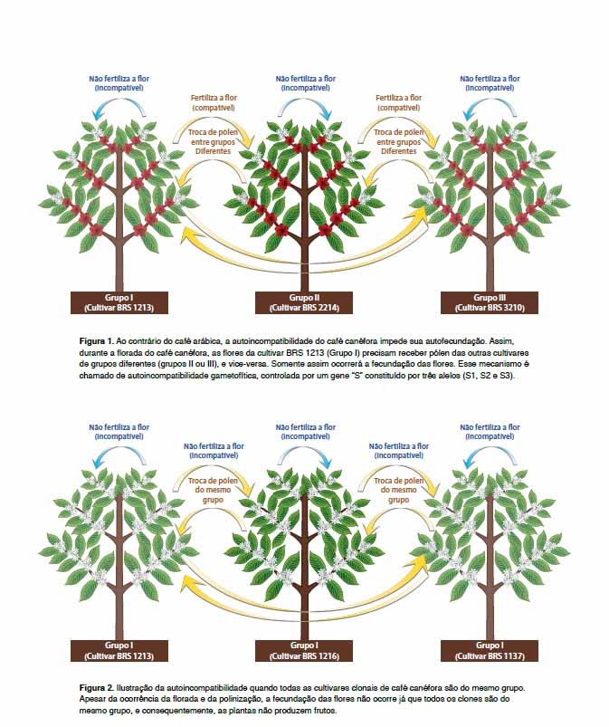 Para que o cafeeiro canéfora (conilon ou robusta) produza frutos é necessária a presença de plantas com diferentes perfis genéticos na mesma lavoura, o que é obtido com a plantação de clones distintos. Isso porque essa espécie é autoincompatível, ou seja, não ocorre fecundação entre flores da mesma planta nem entre indivíduos geneticamente iguais. Caso os materiais genéticos cultivados sejam muito próximos, aparentados, haverá deficiência nos cruzamentos. Por esses motivos, para haver produção e sem saber a compatibilidade, os produtores implantam diversos clones para garantir polinização e fecundação das flores.