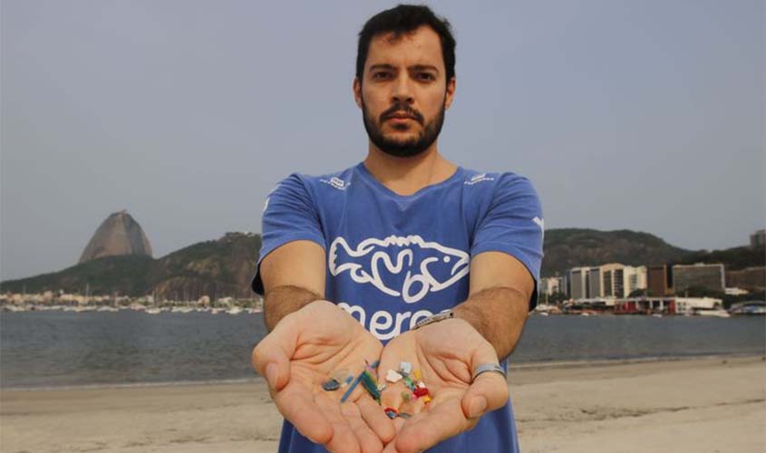 Rio de Janeiro - O biólogo Jonas Leite, doutor em oceanografia, presidente do Instituto Meros do Brasil, mostra microplástico vindo do mar e coletados na areia da praia de Botafogo - Fernando Frazão/Agência Brasil