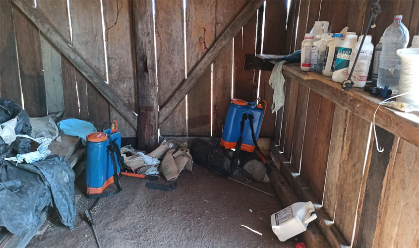 No local foram encontrados diversos frascos de veneno e bombas de aplicação, porém nemhum EPI para a proteção dos trabalhadores.