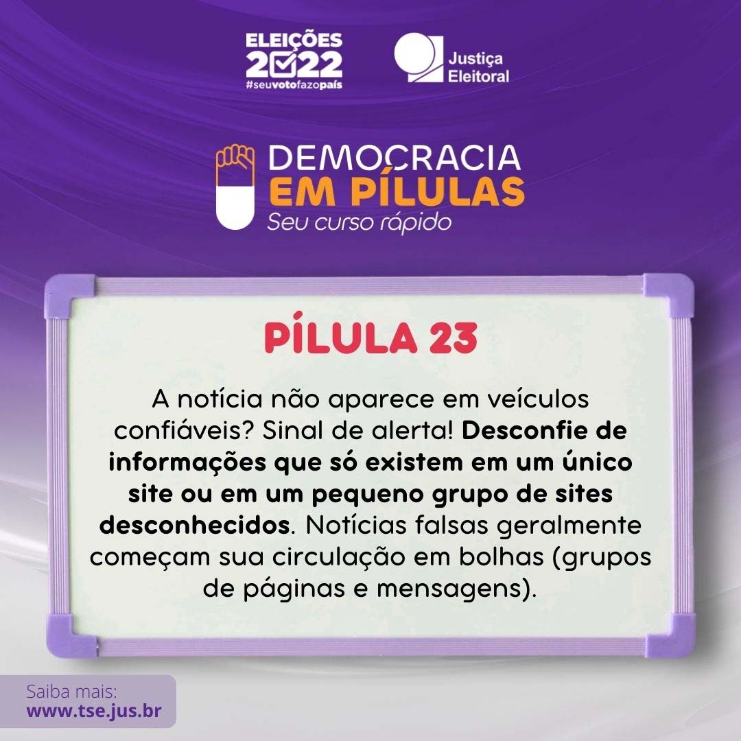 Esse é o 23o texto da série #DemocraciaEmPílulas, que publica durante todos os dias deste mês de junho mensagens curtas nas redes sociais para reforçar a importância do combate à desinformação no processo eleitoral.