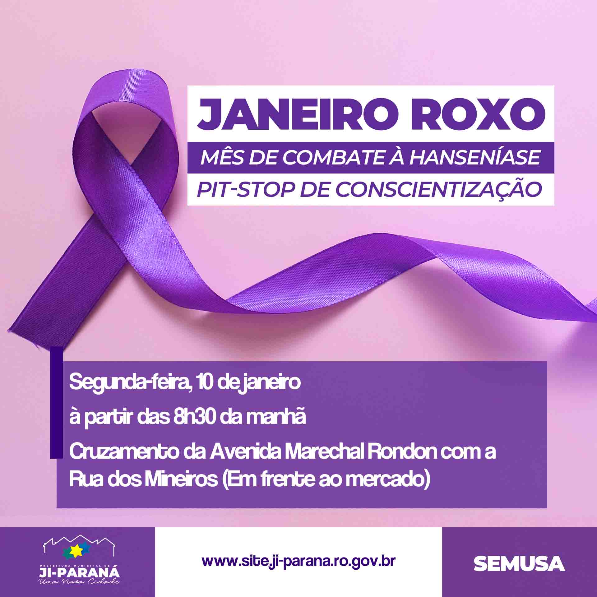 Nesta segunda-feira (10), a Secretaria Municipal de Saúde (Semusa) realizará um pit-stop educativo da Campanha Janeiro Roxo, o mês de prevenção e combate à hanseníase. A ação acontece a partir das 8h30, no cruzamento entre a avenida Marechal Rondon e a Rua dos Mineiros, em frente ao Supermercado Irmãos Gonçalves.