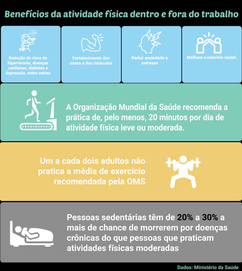 Mesmo praticando atividade física regularmente, a analista de controle de investimentos Iasmin Messias, de 22 anos, é participante assídua da ginástica laboral no lugar onde trabalha. Três vezes por semana, uma fisioterapeuta auxilia os funcionários da empresa na prática do exercício. “Isso me ajuda bastante, e acho que à maioria também, porque é uma pausa no trabalho. Às vezes, a gente está com a cabeça tão cheia que aquela pausa faz melhorar até seu desempenho na atividade do dia a dia”, comenta.