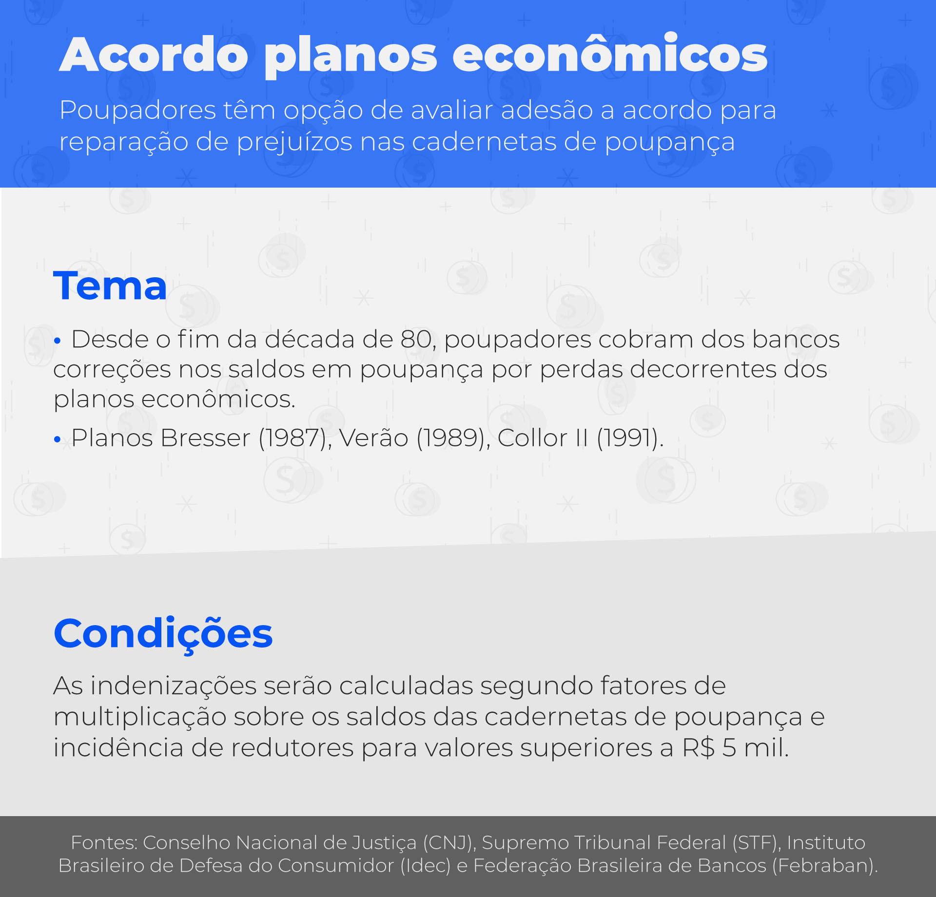 A mobilização pelo fim de um litígio que tramita há 30 anos na justiça brasileira tem colocado frente a frente poupadores e representantes de bancos para uma oportunidade de acordo e encerramento dos processos. O ponto de partida para o fim dessa disputa que envolve milhares de pessoas idosas, cerca de 700 mil processos, foi dado pelo Supremo Tribunal Federal (STF) com a homologação de acordo coletivo possível de ser estendido para outras ações individuais e coletivas.