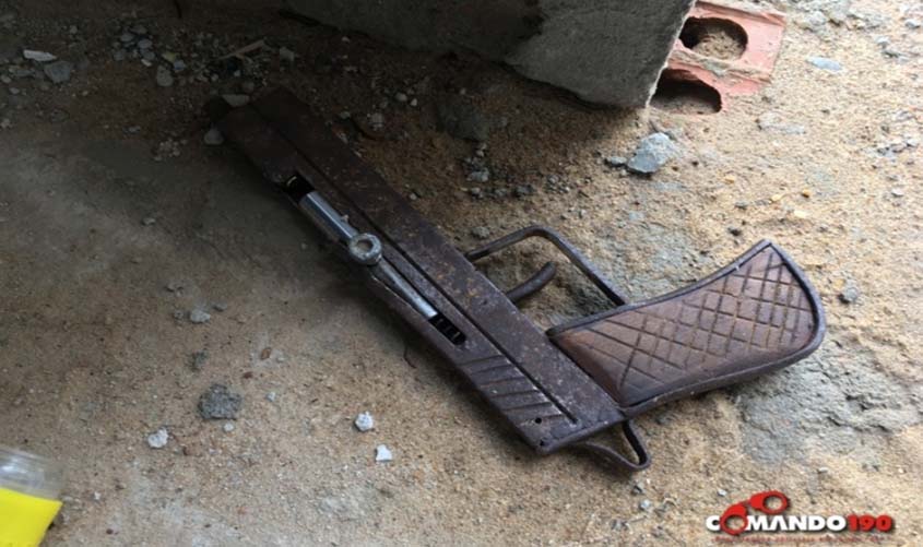 Durante as buscas pelas imediações, os PM’s localizaram uma arma de fogo de fabricação caseira, calibre 22, com uma munição intacta.