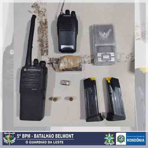 A Polícia Militar de Rondônia (PMRO), por meio dos trabalhos de equipes de Força Tática do 5º BPM, localizou em um apartamento várias unidades de entorpecentes, dois radiocomunicadores, dois carregadores de armamento e munição em residencial na Zona Leste da Capital, durante a noite do dia 11 de maio.