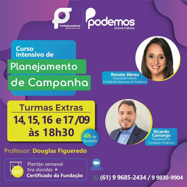 Depois de capacitar mais de 5.000 filiados, entre pré-candidatos, coordenadores de campanha e dirigentes partidários, o maior Programa de Planejamento de Campanha do Podemos no país está de volta. Atendendo a muitos pedidos, o partido e a Fundação Podemos decidiram abrir mais quatro turmas.