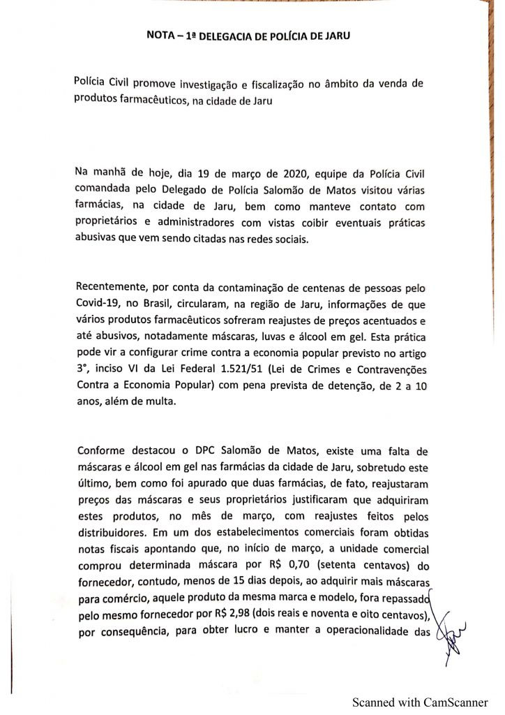 Recentemente, por conta da contaminação de centenas de pessoas pelo Covide-19, no Brasil, circulam, na região de jaru, informações de que vários produtos farmacêuticos sofrem reajustes de preços acentuado e até abusivos