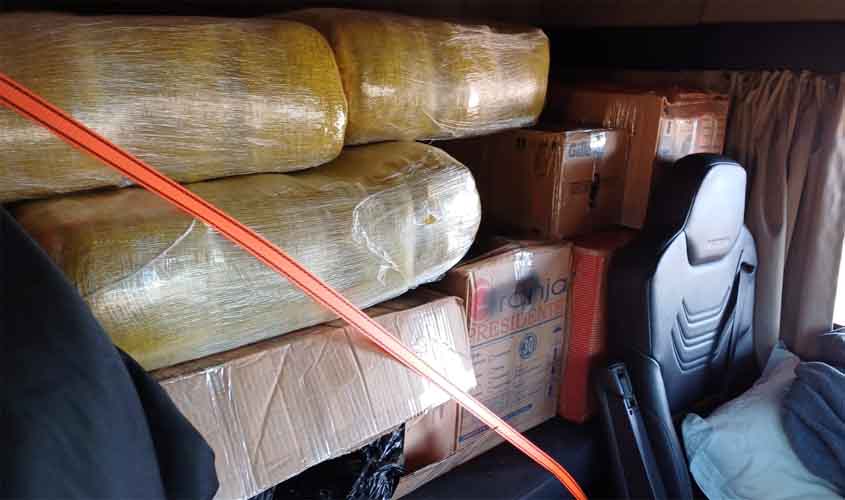O caminhão, que fazia o trajeto de Jaru/RO com destino a Nova Mutum/MT, foi interceptado após troca de informações entre as instituições. Durante a fiscalização, os policiais localizaram diversas caixas e sacos plásticos ocultos na cabine do veículo, contendo 349,520 kg da substância ilícita.