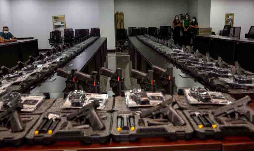 Foram entregues à Sejus 852 pistolas calibre nove milímetros semiautomática, para policiais penais do Estado