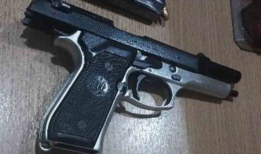 Ao realizarem uma busca pessoal, os militares encontraram uma pistola marca Bereta calibre 9mm na cintura do abordado, sendo que ele relatou estar armado em razão de estar sofrendo ameaças de morte por desafetos.