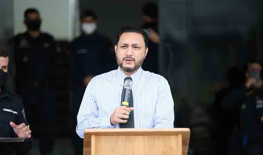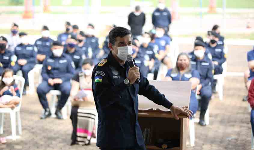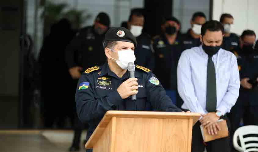 O comandante-geral da PMRO, coronel PM Alexandre Luís de Freitas Almeida, conduziu a cerimônia juntamente com o subcomandante da PMRO, coronel PM Plínio Sérgio Cavalcanti que realizou uma oração abençoando o ano e todos os policiais militares.