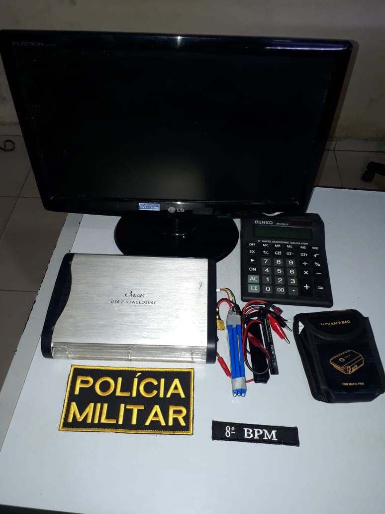 Os militares pararam para verificar o que tinha no local e encontraram um monitor de computador, um gravador de DVD, carregador de Air soft, uma calculadora e outros objetos.