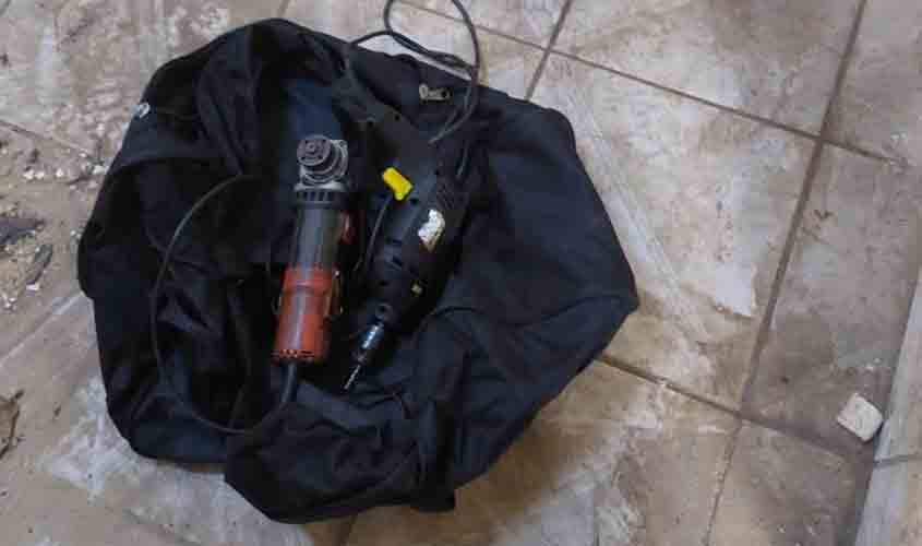 Uma equipe policial em patrulhamento pelo bairro Setor 02 realizou uma revista em um prédio abandonado frequentada por usuários de drogas. Durante a revista, foi encontrada em um dos quartos uma bolsa contendo uma furadeira e uma esmerilhadeira, ferramentas que haviam sido furtadas em uma residência.